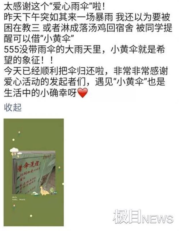 极目新闻3月19日讯(记者邹浩 通讯员娄新雅)3月18日,湖北大学2019级会计学专业学生陈甜诗雨在朋友圈晒出借伞流程图,并配文“遇见小黄伞也是生活中的小确幸”,点燃了湖大“爱心雨伞”传递的春日温情。