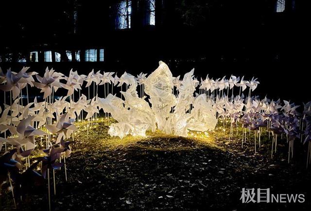 夜幕降临,校园主干道旁的花园中涌动着星星点点的暖色微光,400只纯白的风车如同花朵般环绕在绿植中,形成独特又美丽的风景,春风拂过,风车悠悠转动,仿佛人与自然在对话……