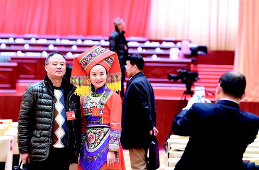 1月9日,参加武汉两会的代表委员现场留影,来自湖北大学的林季彬委员特意穿上了民族服饰。