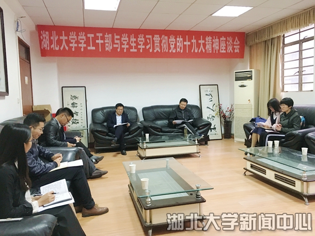 10月18日,按照学校党委统一部署,学生工作部(处)、研究生工作部、校团委组织学生在三号楼报告厅、各学院会议室和学生寝室等地点收看收听党的十九大开幕式盛况。当天下午,学生工作部(处)在综合楼二楼会议室召开学习贯彻党的十九大精神座谈会,10名来自不同部门和学院的学工干部和学生代表畅谈学习心得。