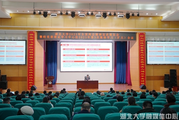 3月24日,学校召开2023年全国两会精神宣讲报告会暨党委理论学习中心组2023年第3次集体学习(扩大)会议。第十二届、十三届、十四届全国人大代表,享受国务院特殊津贴专家,华工科技产业股份有限公司董事长马新强研究员应邀作宣讲报告。校党委书记谢红星主持会议并讲话。在校校领导,全校中层干部,民主党派负责人、无党派代表人士、侨联负责人参加报告会。